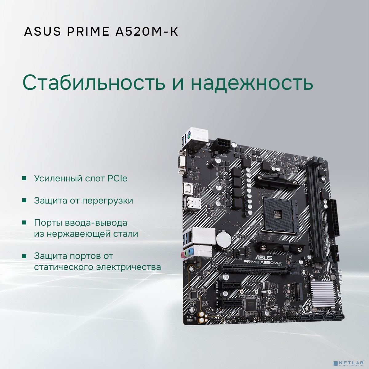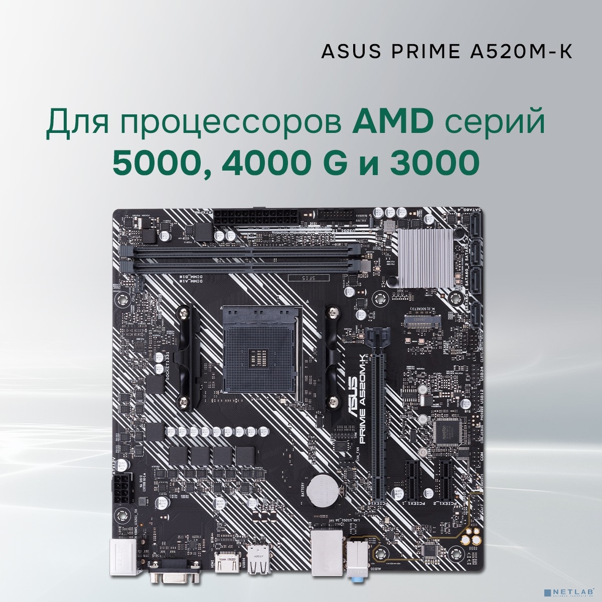 ASUS PRIME A520M-K (Socket AM4, mATX, 2xDDR4(64GB), VGA/HDMI 2.1, 1xPCIe 3.0x16/2xPCIe 3.0, 1xLAN, 4xSATA 6Gb/s, 1xM.2, 4xUSB 3.2, 2xUSB 2.0, 1xPS/2)