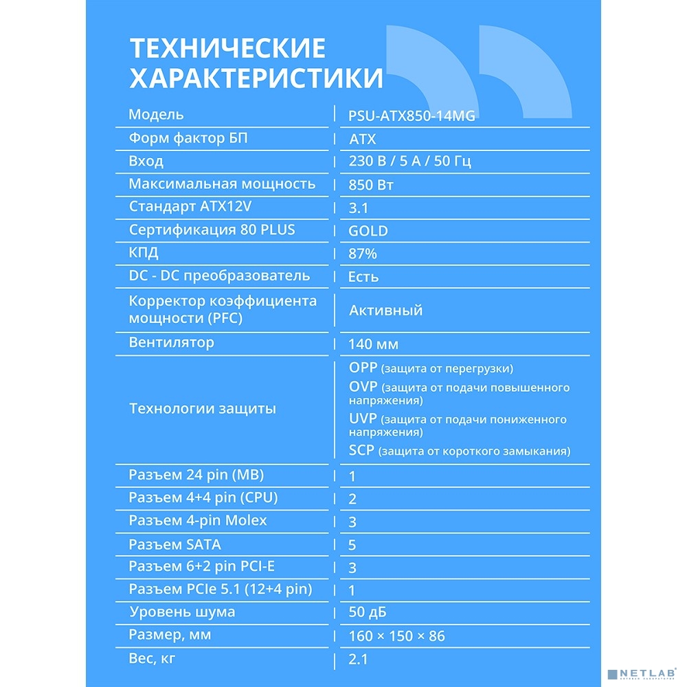Блок питания CBR ATX 850W 80+ Gold, Full Modular, DC-DC, APFC, 24pin, 1*PCIE5.1(12+4pin), 2*8-pin(4+4P), 3*6+2pin, 5*SATA, 3*IDE, 14cm fan, 1.5м кабель питания, черный [PSU-ATX850-14MG] BOX