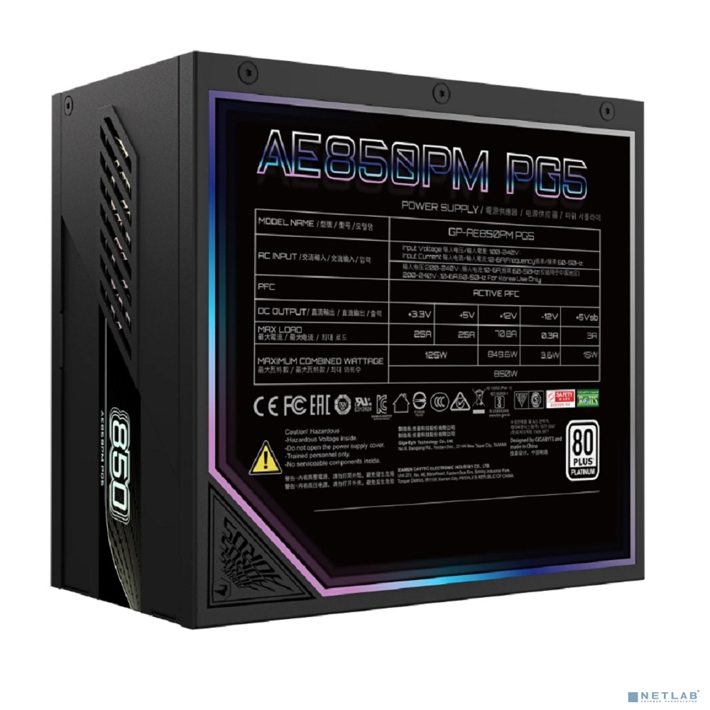 Блок питания ПК Gigabyte AE850PM PG5 850W, 80Plus, Platinum, Полностью модульный, PCIe Gen 5.1, ATX 3.0 compatible.