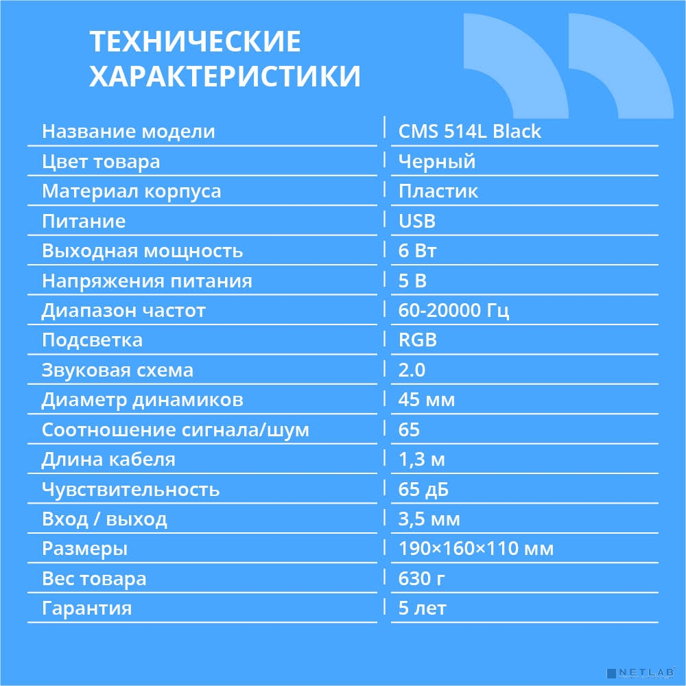 CBR CMS 514L Black, Акустическая система 2.0, питание USB, 2х3 Вт (6 Вт RMS), пластик, RGB-подсветка, конструкция-транформер, 3.5 мм лин. стереовход, регул. громк., длина кабеля 1,3 м, цвет чёрный