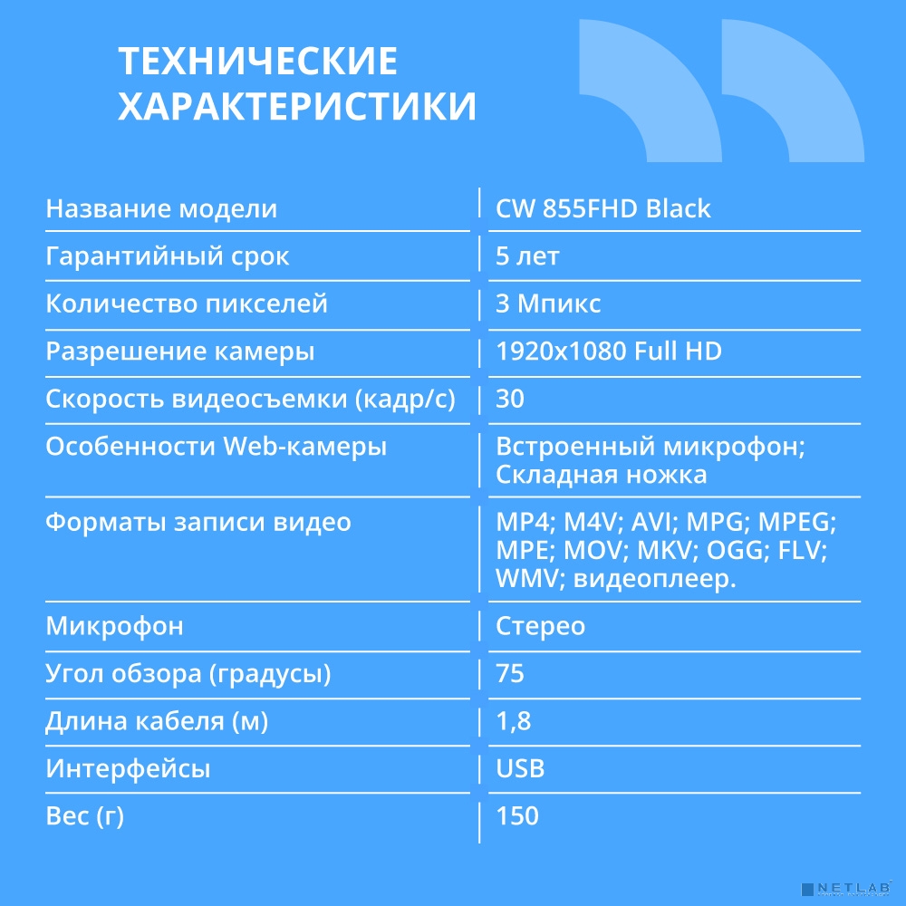 CBR CW 855FHD Black — это высококачественная веб-камера, которая обеспечивает четкое и яркое изображение благодаря своей матрице на 3 МП. С разрешением видео 1920х1080 вы сможете наслаждаться плавной и детальной картинкой во время видеоконференций или стримов.