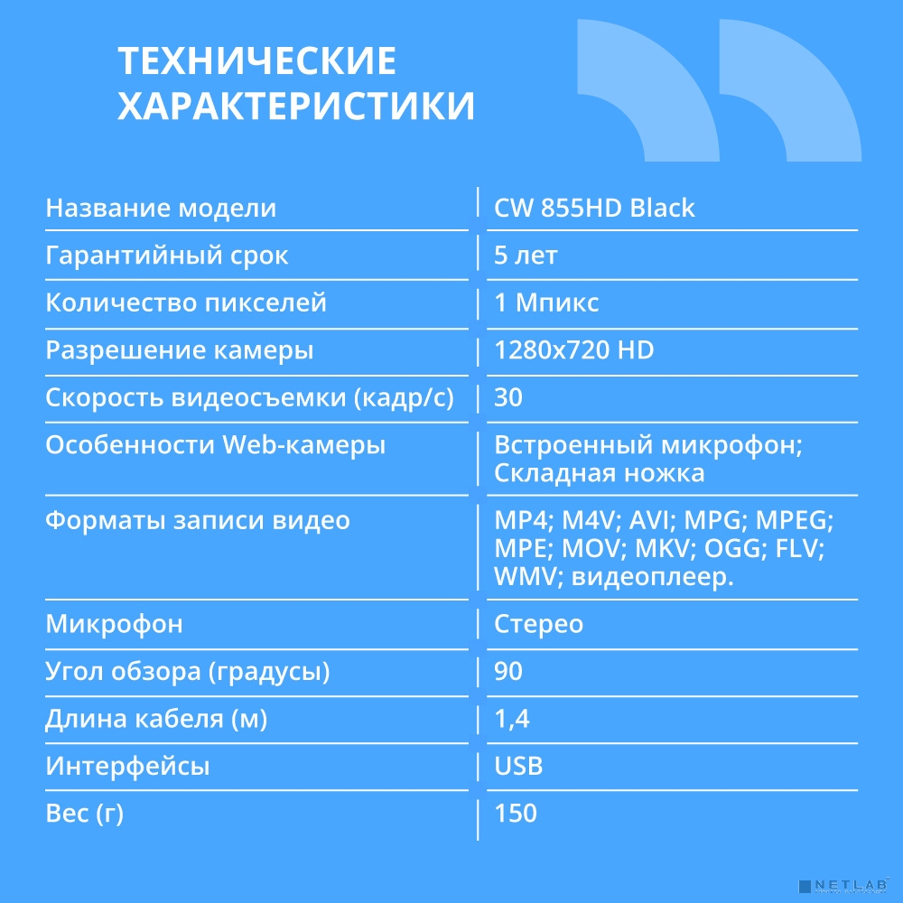 CBR CW 855HD Black — это универсальная веб-камера, которая станет незаменимым помощником для видеоконференций и онлайн-общения.
