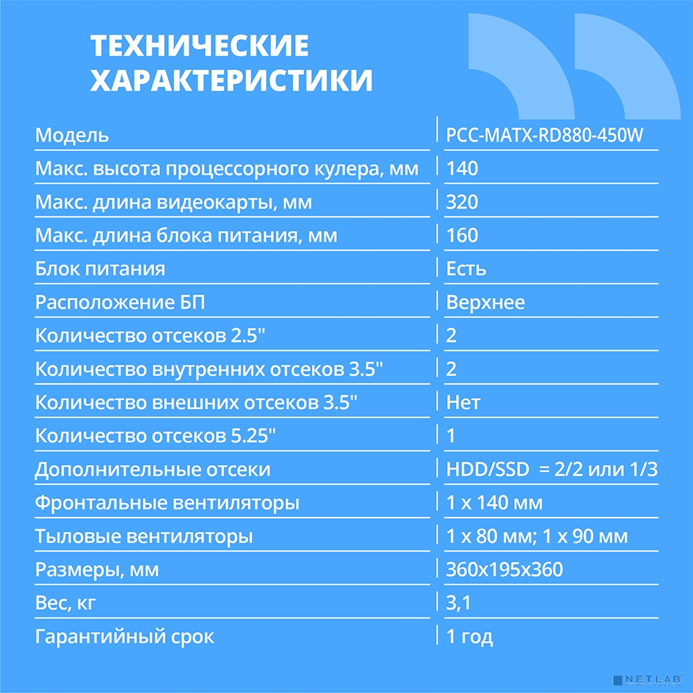 CBR Корпус mATX Minitower RD880, c БП PSU-ATX450-12EC (450W/120mm), 2*USB 3.0, 2*USB 2.0, HD Audio+Mic, кабель питания 1.2м, Black [PCC-MATX-RD880-450W]