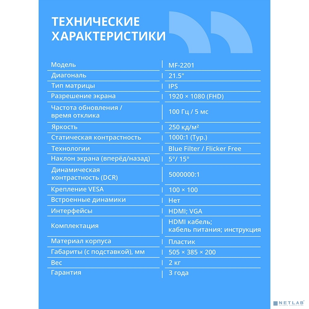 CBR LCD Монитор 21.5" MF-2201, IPS, FHD 1920x1080, 100Гц, 1*HDMI, 1*VGA, внутренний БП, черный, кабель HDMI 1.5м в комплекте, VESA крепление для миниПК