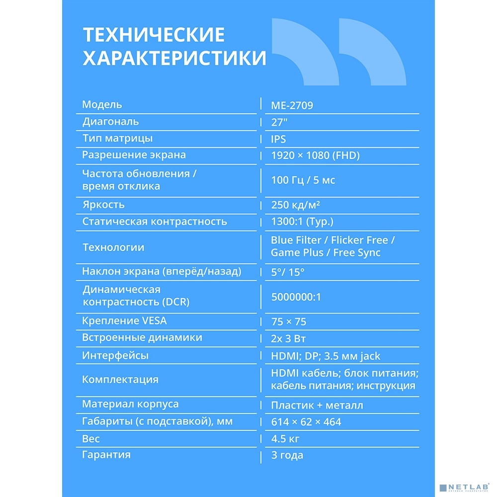 CBR LCD Монитор 27" ME-2709, IPS, FHD 1920x1080, 100Гц, Динамики 2*3W, 1*DP, 1*HDMI, внешний БП, FreeSync, черный, кабель HDMI 1.5м в комплекте, VESA крепление для миниПК [LCD-ME2709-OPC]