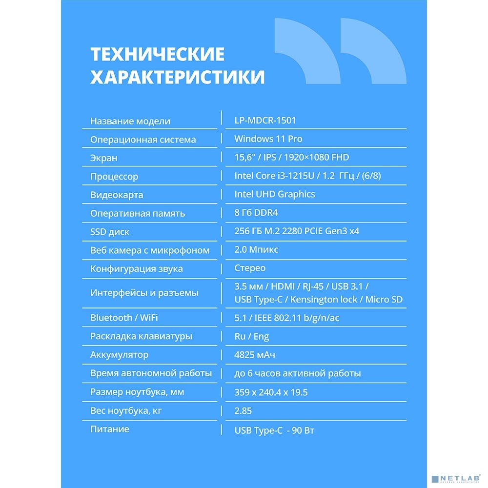 CBR LP-MDCR-1501 15.6" FHD IPS (Intel i3-1215U(1.3GHz) / 8Gb DDR4 3200MHz (2slot) / 256Gb SSD PCIe /Intel UHD Graphics (support Iris Xe with dual RAM) / RJ45 / W11Pro/4250 mAh /металл+ пластик)