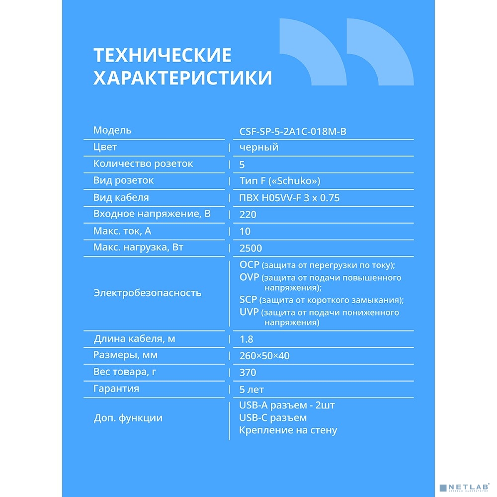 CBR Сетевой фильтр CSF SP-5-2A1C-018M-B, 10A, 5 евророзеток, 2x USB Type-A 2.0, 1x USB Type-C, 3x0.75мм2, 1.8 м, чёрный
