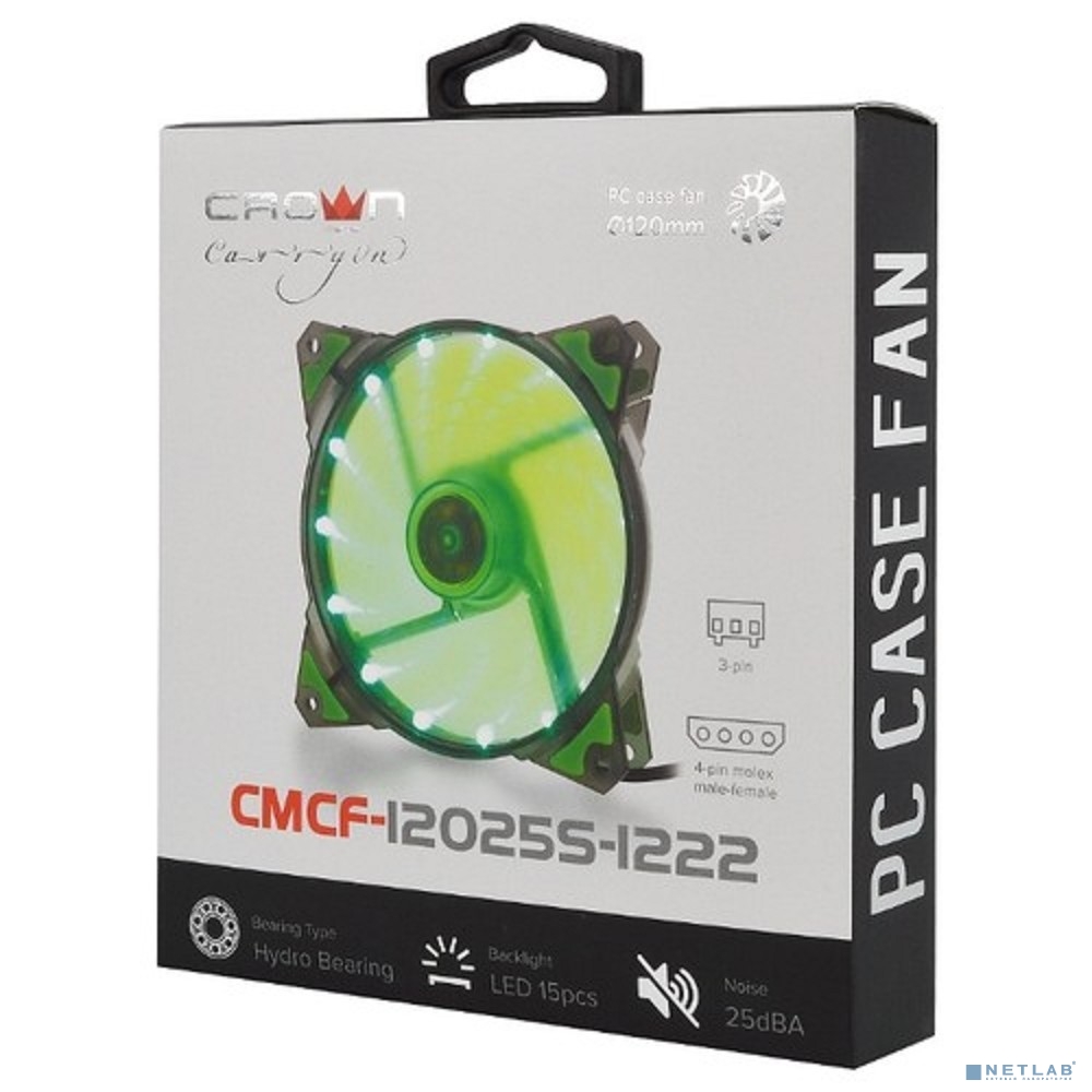 CROWN Вентилятор для компьютерного корпуса CMCF-12025S-1222 (120*120*25мм;Зелёный 16LED;1500 об/мин;35CFM;20Дб;Подшипник скольжения;3pin+MOLEX(папа-мама) 40+10см)