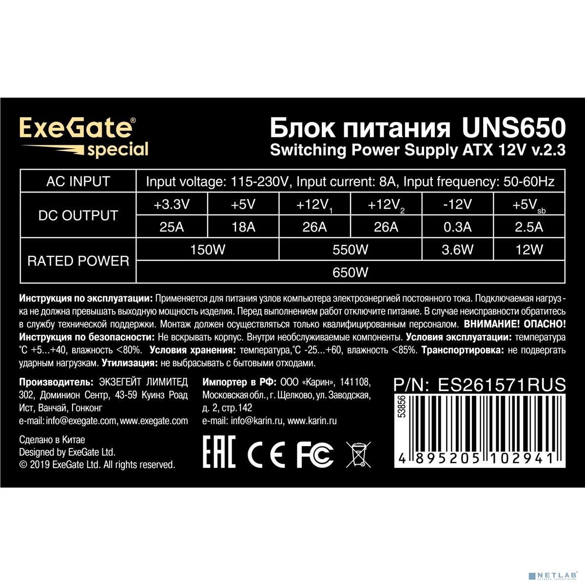 Exegate ES261571RUS Блок питания 650W Exegate Special UNS650, ATX, 12cm fan, 24p+4p, 6/8p PCI-E, 3*SATA, 2*IDE, FDD