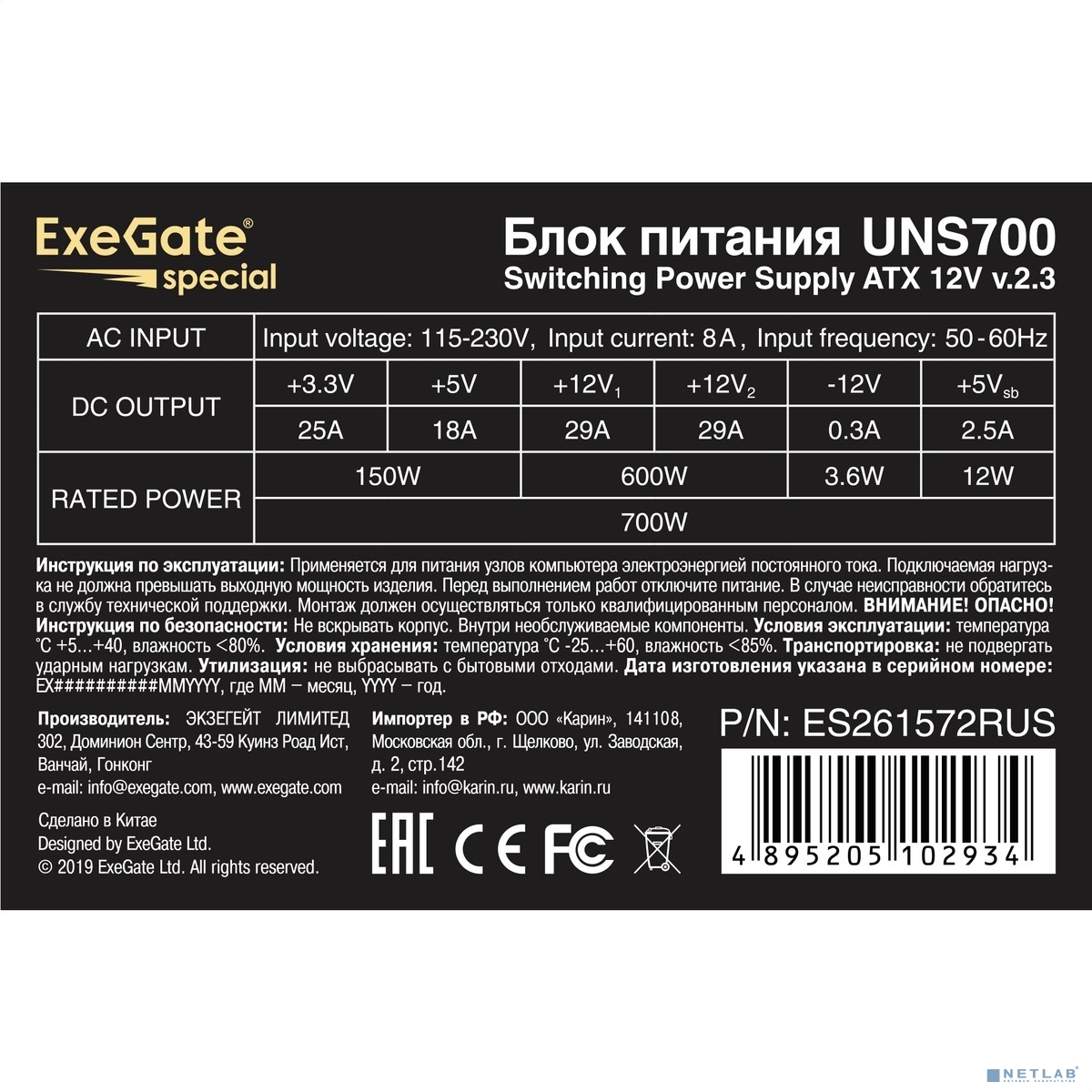 Exegate ES261572RUS Блок питания 700W Exegate Special UNS700, ATX, 12cm fan, 24p+4p, 8/6p PCI-E, 3*SATA, 2*IDE