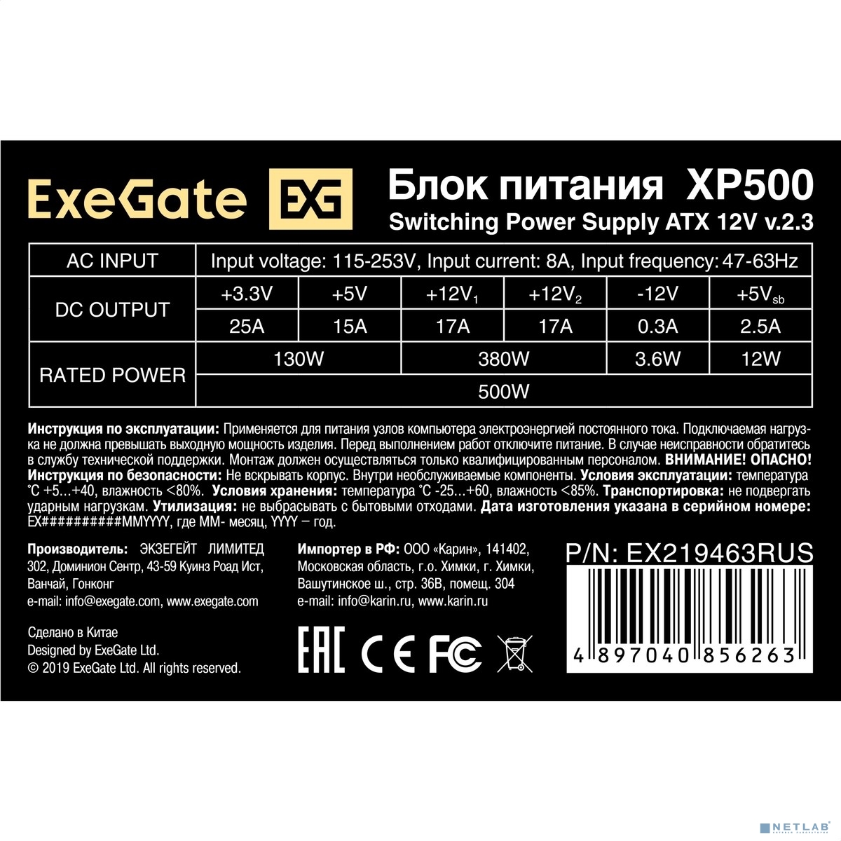 Exegate EX219463RUS 251775 Блок питания 500W ATX-XP500 OEM, black, 12cm fan, 24+4pin, (6+2)pin PCI-E, 3*SATA, 1*FDD, 2*IDE