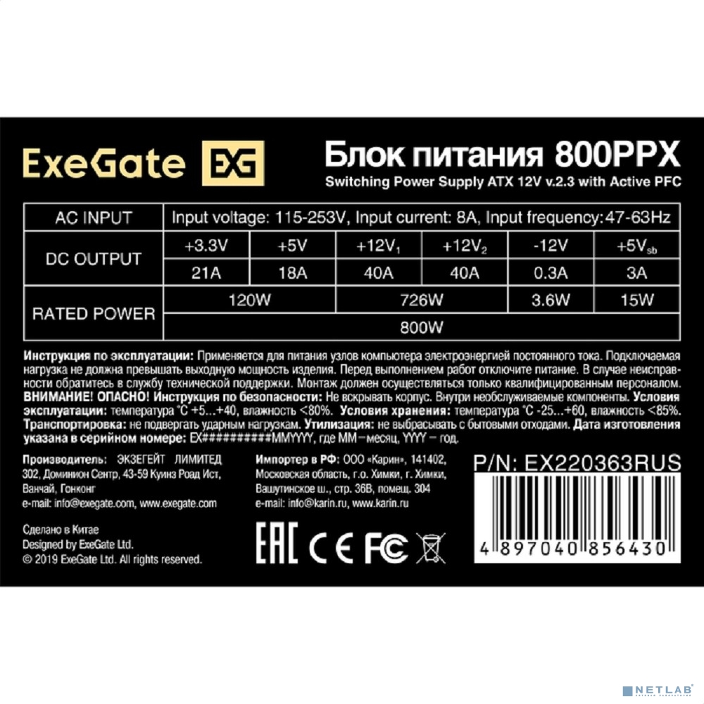 Exegate EX220363RUS Блок питания 800W ATX-800PPX RTL, black, active PFC, 13.5cm, 20+4p/4+4p/PCI-E/4*IDE/5*SATA