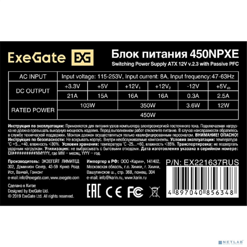 Exegate EX221637RUS-PC Блок питания 450W ExeGate 450NPXE (ATX, PPFC, PC, 12cm fan, 24pin, 4pin, PCIe, 3xSATA, 2xIDE, black, кабель 220V в комплекте)