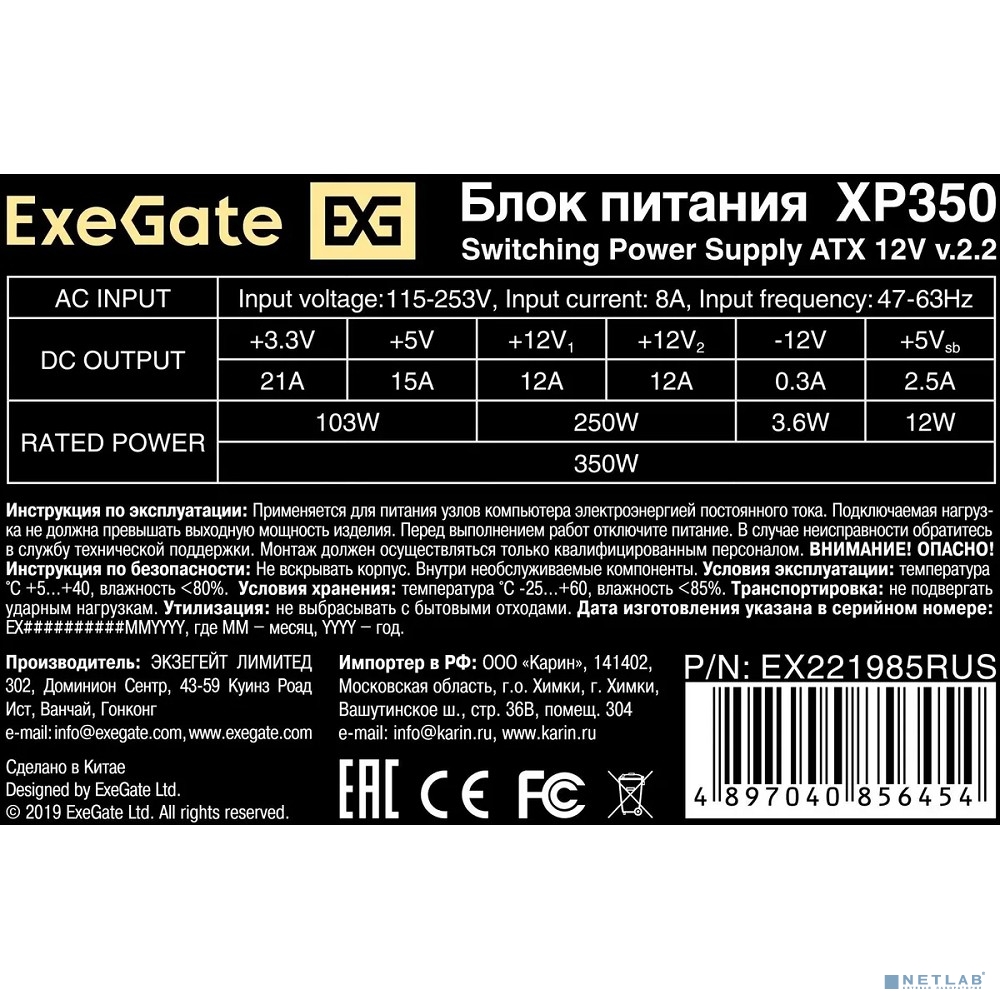 Exegate EX221985RUS Блок питания 350W ATX-XP350 OEM, black, 12cm fan, 24+4pin, 3*SATA, 1*FDD, 2*IDE [251758]