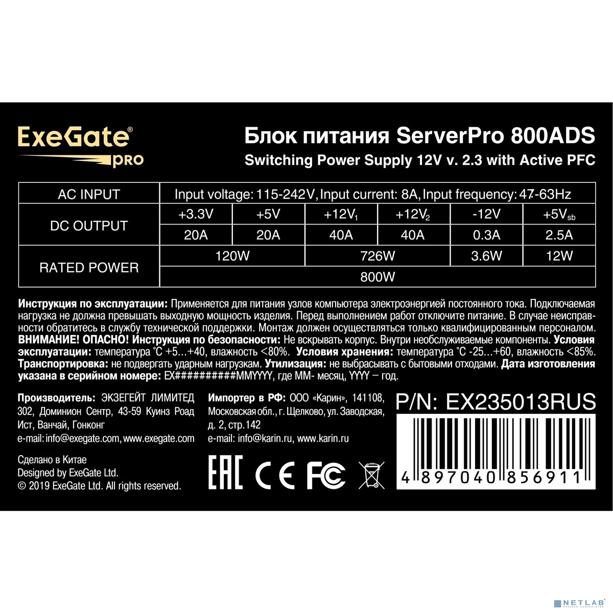 Exegate EX235013RUS Блок питания 800W Exegate / (Server) PRO,APFC OEM,2x8cm fan, 20+4pin/(4+4)pin+(4+4)pin , 2xPCI-E , 9xSATA