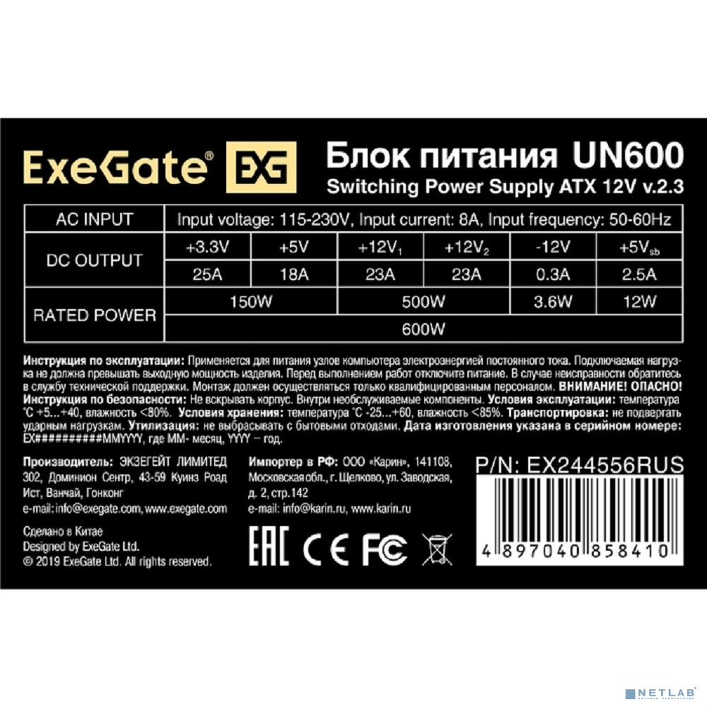 Exegate EX244556RUS Блок питания 600W Exegate UN600, ATX, 12cm fan, 24+4pin, 6pin PCI-E, 4*SATA, 1*FDD, 1*IDE