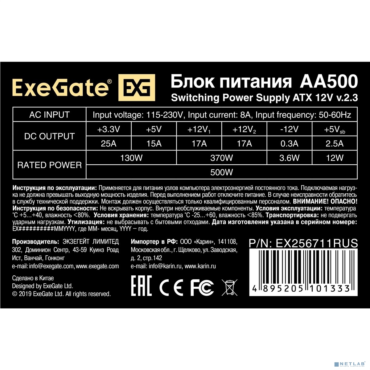 Exegate EX256711RUS Блок питания 500W Exegate AA500, ATX, 8cm fan, 24p+4p, 2*SATA, 1*IDE