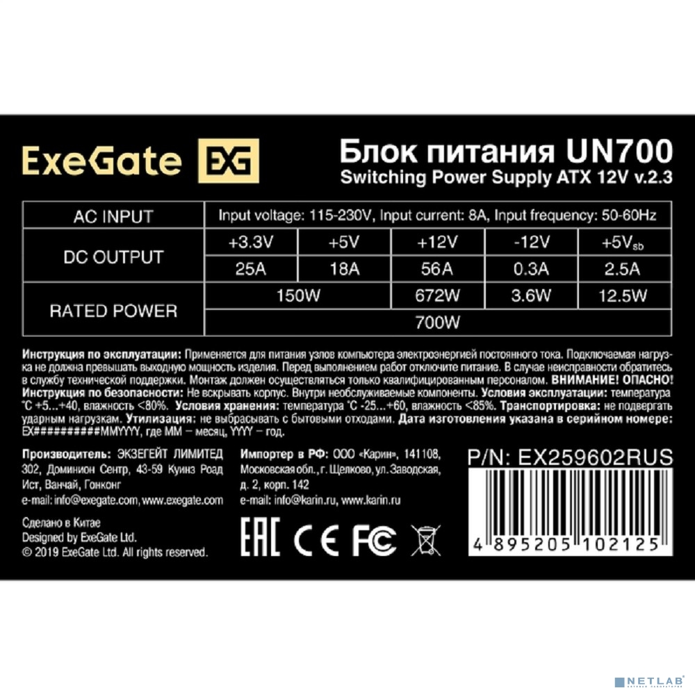 Exegate EX259602RUS Блок питания 700W Exegate UN700, ATX, 12cm fan, 24p+(4+4)p, 6/8p PCI-E, 4*SATA, 2*IDE, FDD