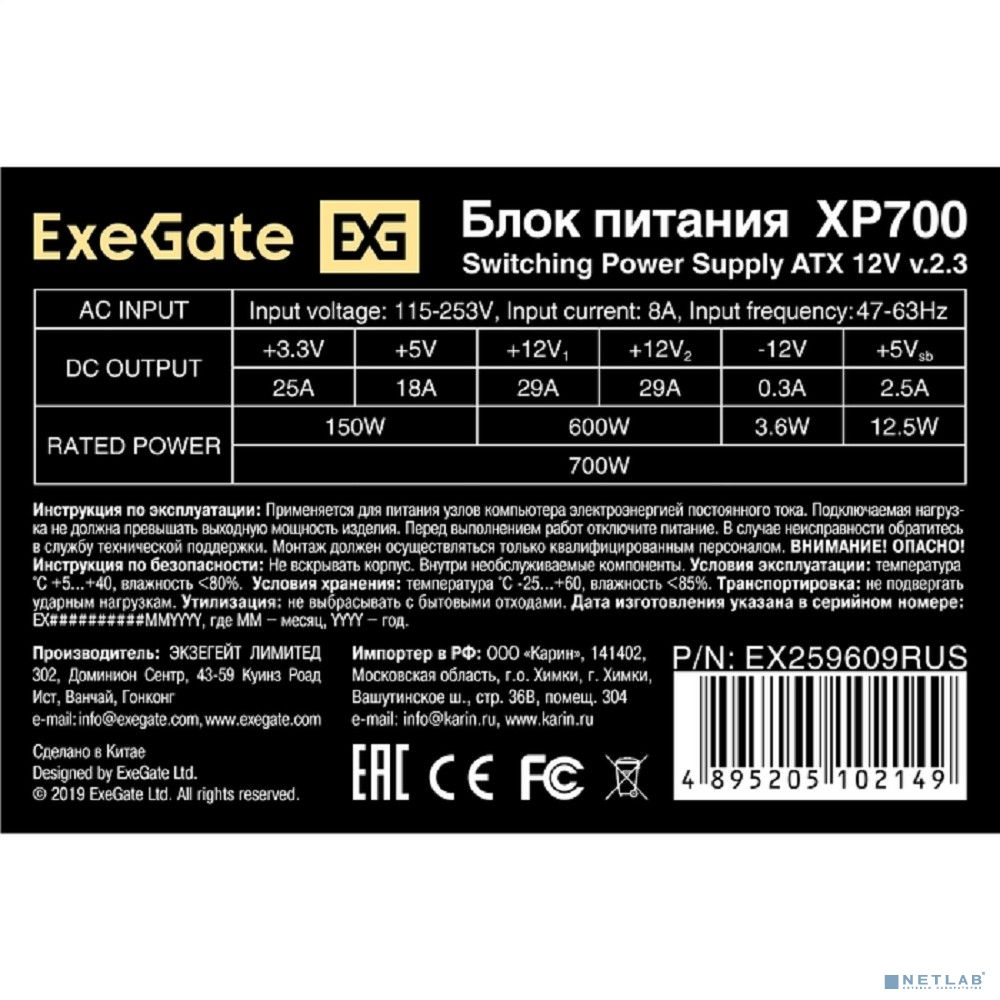 Exegate EX259609RUS Блок питания 700W Exegate XP700, ATX, black, 12cm fan, 24p+(4+4)p, 6/8p PCI-E, 4*SATA, 2*IDE, FDD