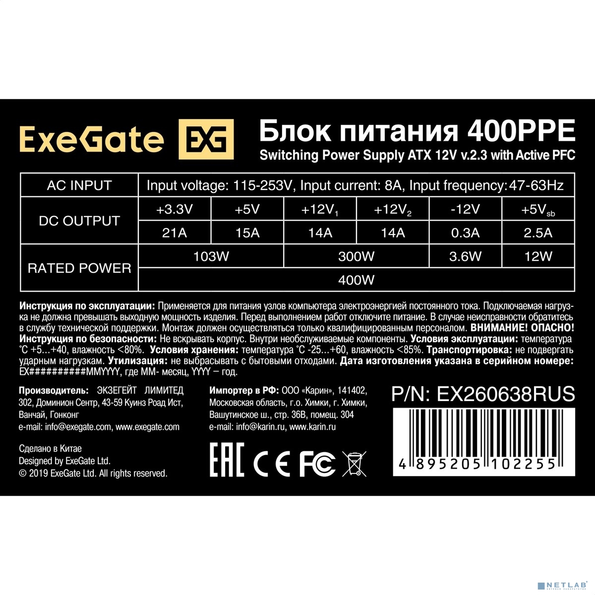 Exegate EX260638RUS Блок питания 400W Exegate 400PPE, ATX, black, APFC, 12cm, 24p+4p, PCI-E, 3*IDE, 5*SATA, FDD