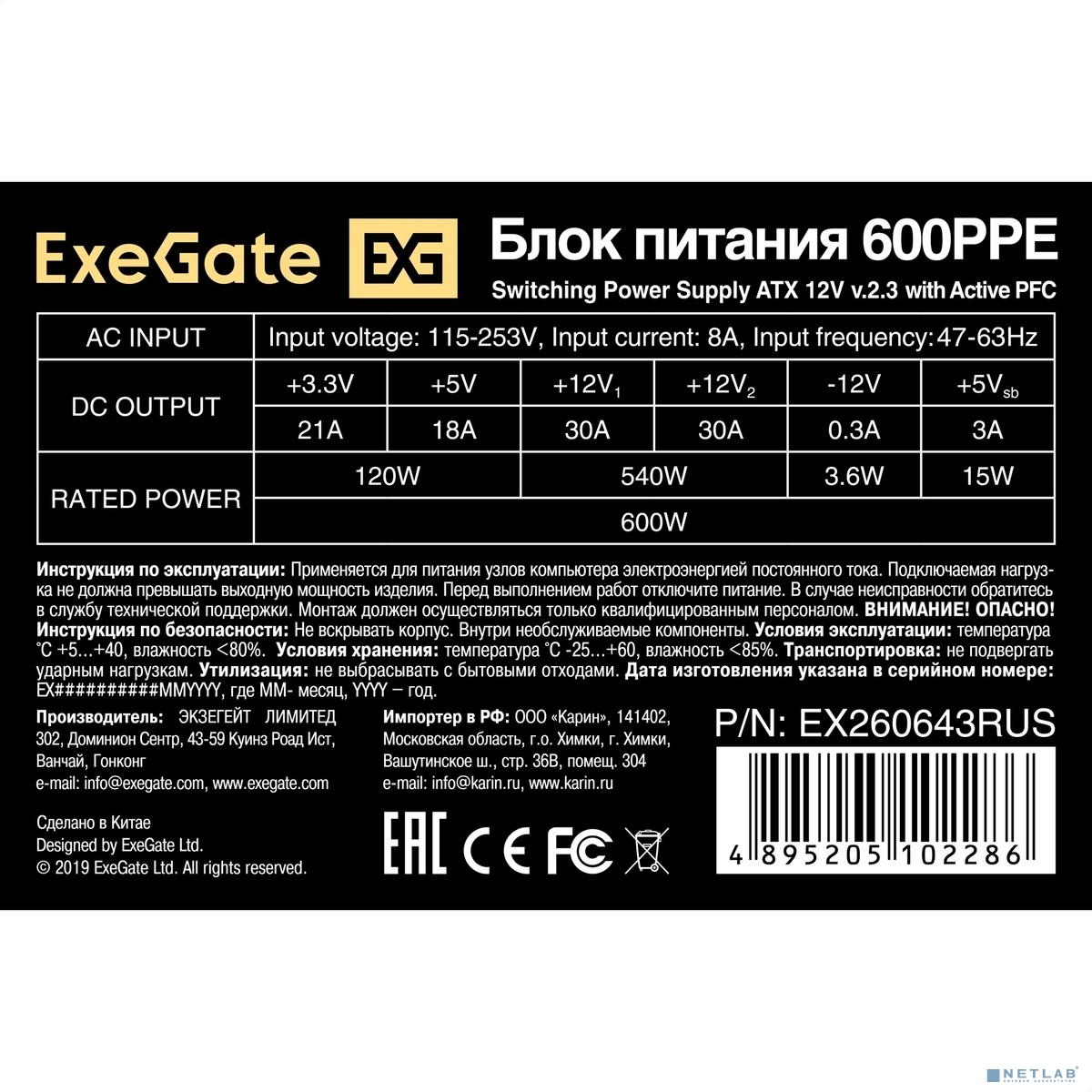Exegate EX260643RUS Блок питания 600W Exegate 600PPE, ATX, black, APFC, 12cm, 24p+(4+4)p, PCI-E, 5*SATA, 3*IDE, FDD