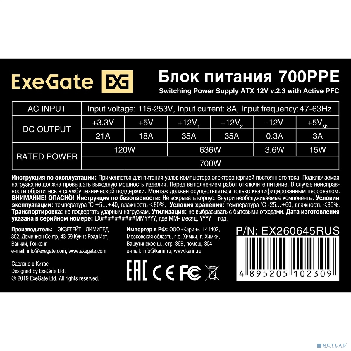 Exegate EX260645RUS Блок питания 700W Exegate 700PPE, ATX, black, APFC, 12cm, 24p+(4+4)p, PCI-E, 5*SATA, 3*IDE, FDD