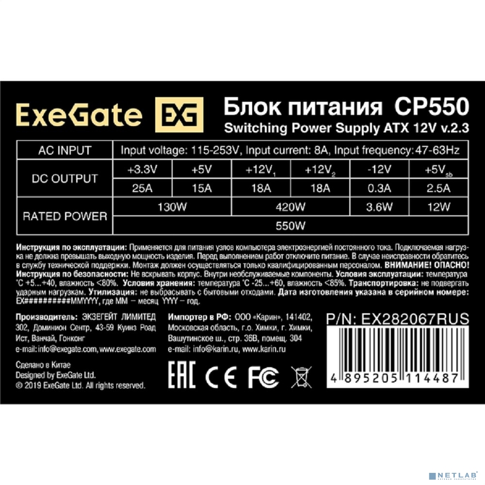 Exegate EX282067RUS Блок питания 550W ExeGate CP550, ATX, 8cm fan, 24p+(4p+4p), 3*SATA, 2*IDE, FDD
