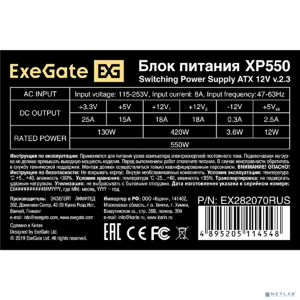 Exegate EX282070RUS-PC Блок питания 550W ExeGate XP550 (ATX, PC, 12cm fan, 24pin, 4pin, PCIe, 3xSATA, 2xIDE, black, кабель 220V в комплекте)