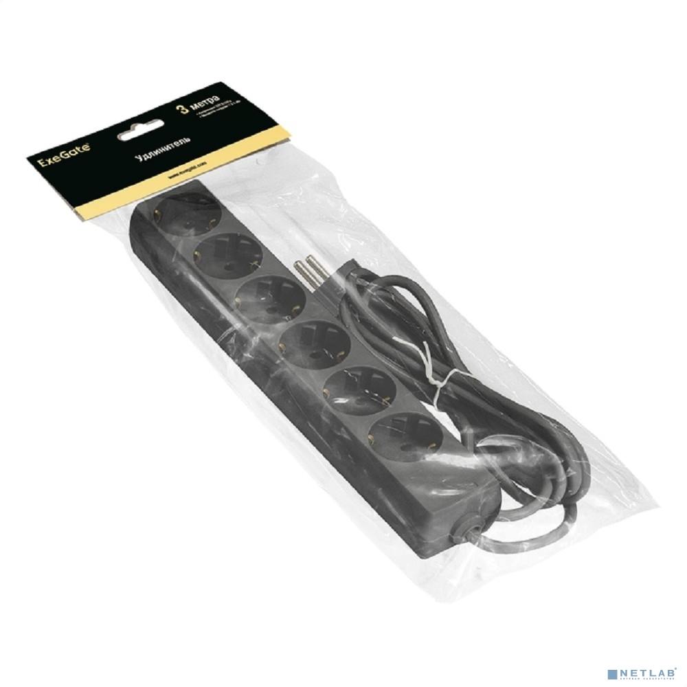 Exegate EX285831RUS Удлинитель ExeGate ECE-6-3B (6 евророзетки с заземлением, 3м, черный)