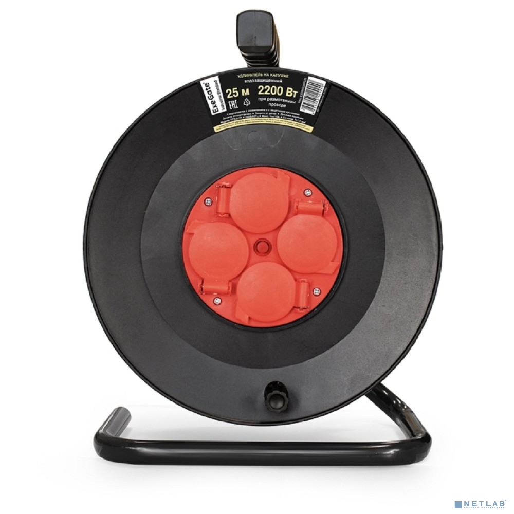 Exegate EX286338RUS Удлинитель на катушке ExeGate industrial ECS-2-1R (4 евророзетки с заземлением и с защитными крышками, IP44, 25м, защита от детей, защита от перегрузки, 3х1,0мм2, 10А/2.2кВт)
