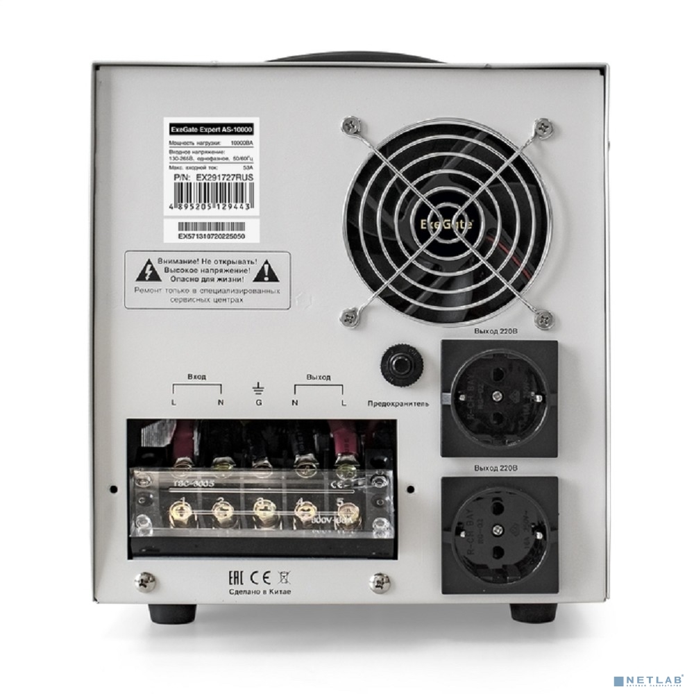 Exegate EX291727RUS Стабилизатор напряжения ExeGate Expert AS-10000 (10000ВА, вход 140...260В, цветной дисплей, выход 220В±8%, КПД 98%, 5 уровней защиты, задержка, усиленный метал. корпус, клем.колодк