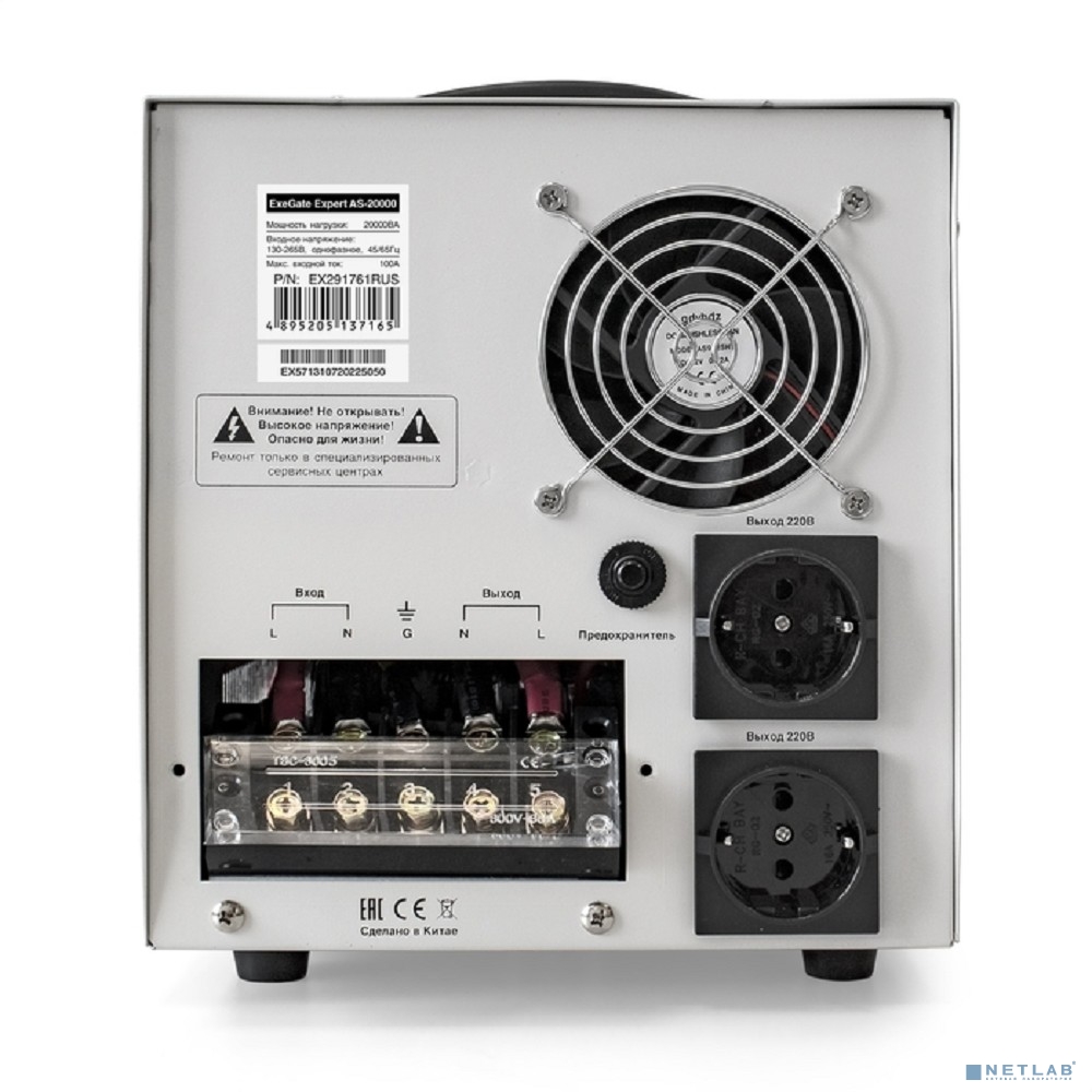 Exegate EX291761RUS Стабилизатор напряжения ExeGate Expert AS-20000 (20000ВА, вход 140-260В, цветной дисплей, выход 220В±8%, КПД 98%, 5 уровней защиты, задержка, усиленный метал. корпус, клем.колодка,