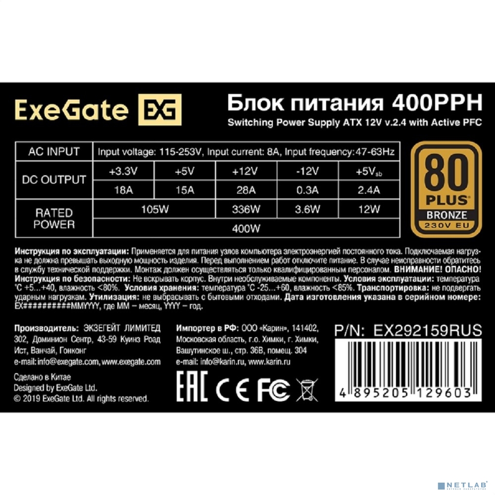 Exegate EX292159RUS-OEM Блок питания 400W ExeGate 80 PLUS® Bronze 400PPH-OEM (ATX, APFC, КПД 88% (80 PLUS Bronze), 12cm fan, 20+4pin, 4+4pin, 2xPCI-E, 5xSATA, 3xIDE, Box, black)