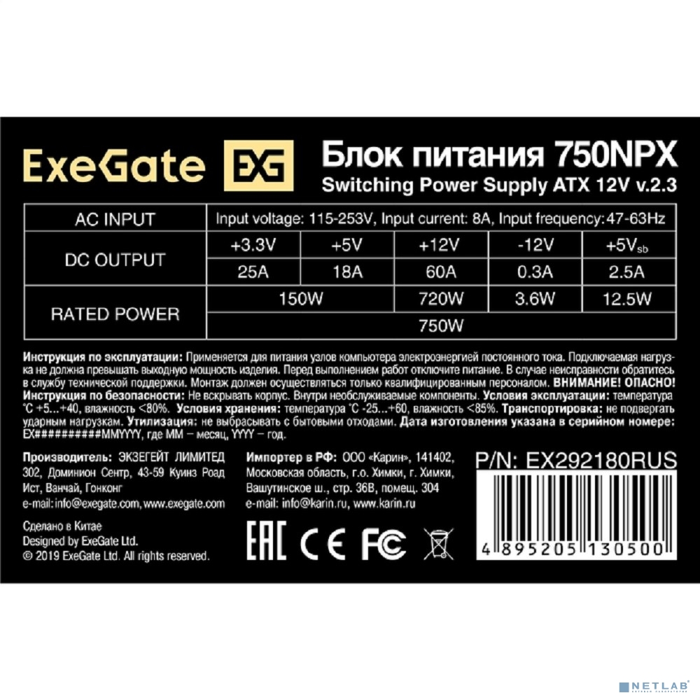 Exegate EX292180RUS Блок питания 750W ExeGate 750NPX (ATX, 12cm fan, 24pin, 4pin, PCIe, 3xSATA, 2xIDE, FDD, black)