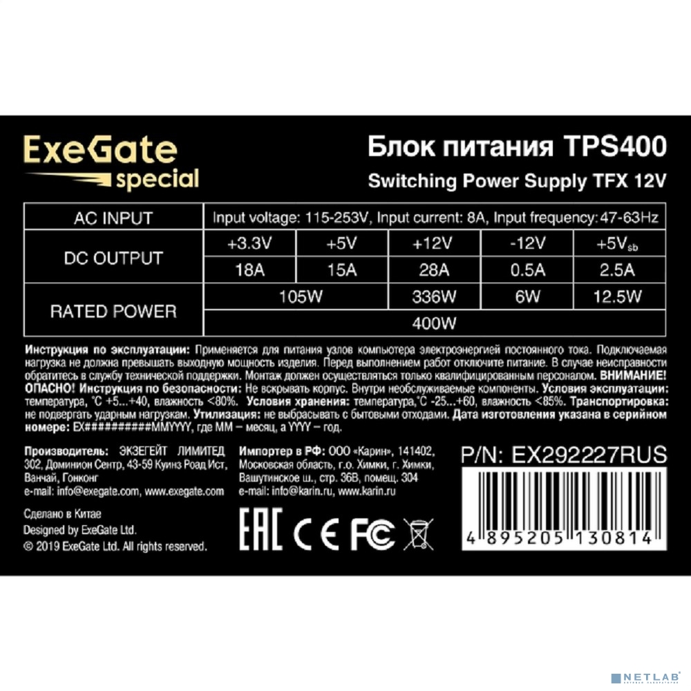 Exegate EX292227RUS Блок питания 400W ExeGate TPS400 (TFX, 8cm fan, 24pin, 4+4pin, 3xSATA, 2xIDE, black)