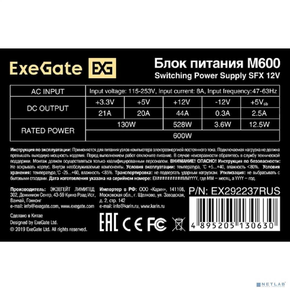 Exegate EX292237RUS Блок питания 600W ExeGate M600 (SFX, APFC, КПД 87% (80 PLUS Silver), 8cm fan, 24pin, (4+4)pin, 2xPCI-E, 3xSATA, 2xIDE, black)