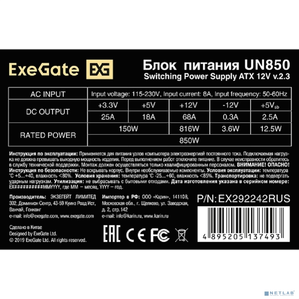 Exegate EX292242RUS Блок питания 850W ExeGate UN850 (ATX, 12cm fan, 24pin, 2x(4+4)pin, PCIe, 3xSATA, 2xIDE)