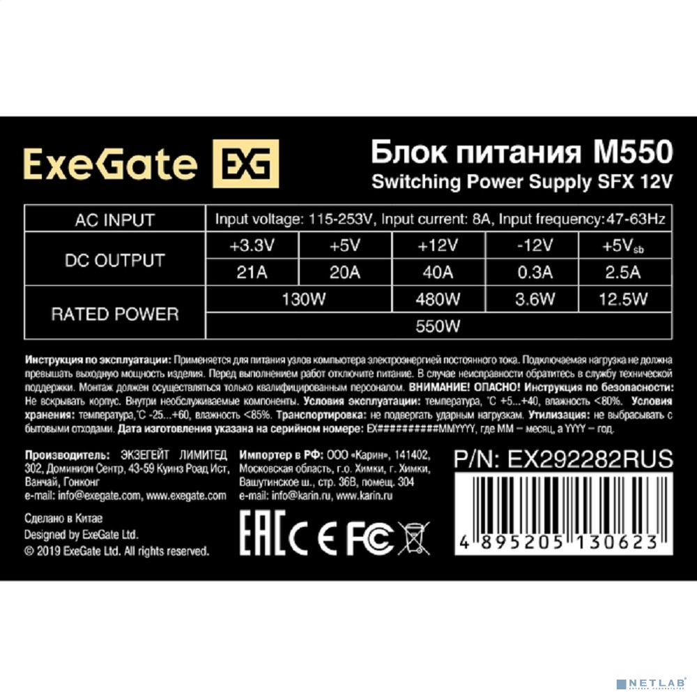 Exegate EX292282RUS Блок питания 550W ExeGate M550 (SFX, APFC, КПД 87% (80 PLUS Silver), 8cm fan, 24pin, (4+4)pin, 2xPCI-E, 3xSATA, 2xIDE, black)