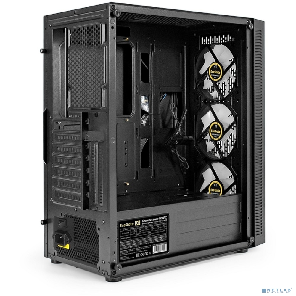 Exegate EX296316RUS Корпус Miditower ExeGate EVO-5001A-450NPX (ATX, БП 450NPX с вент. 12 см, 2*USB+1*USB3.0+HD Audio, черный, 3 вент.12см с RGB подсветкой, боковая панель - закаленное стекло)