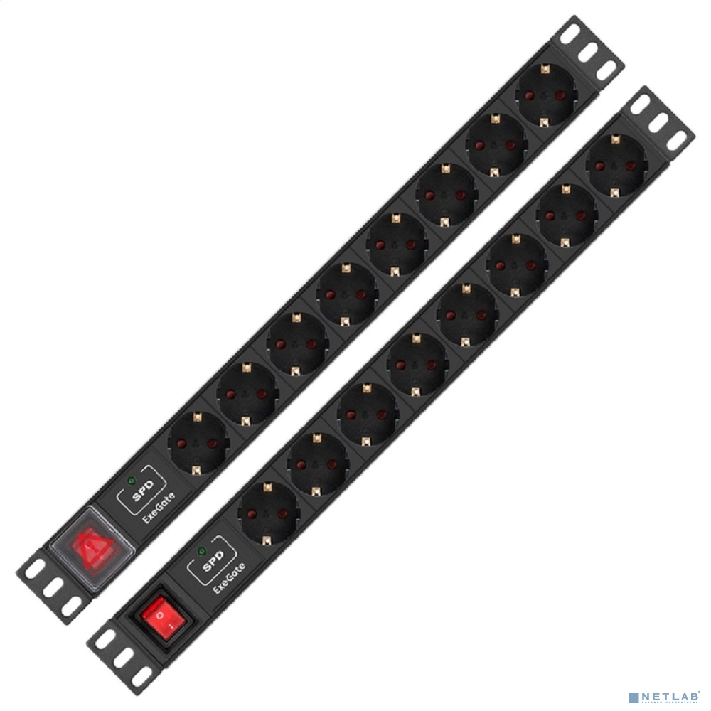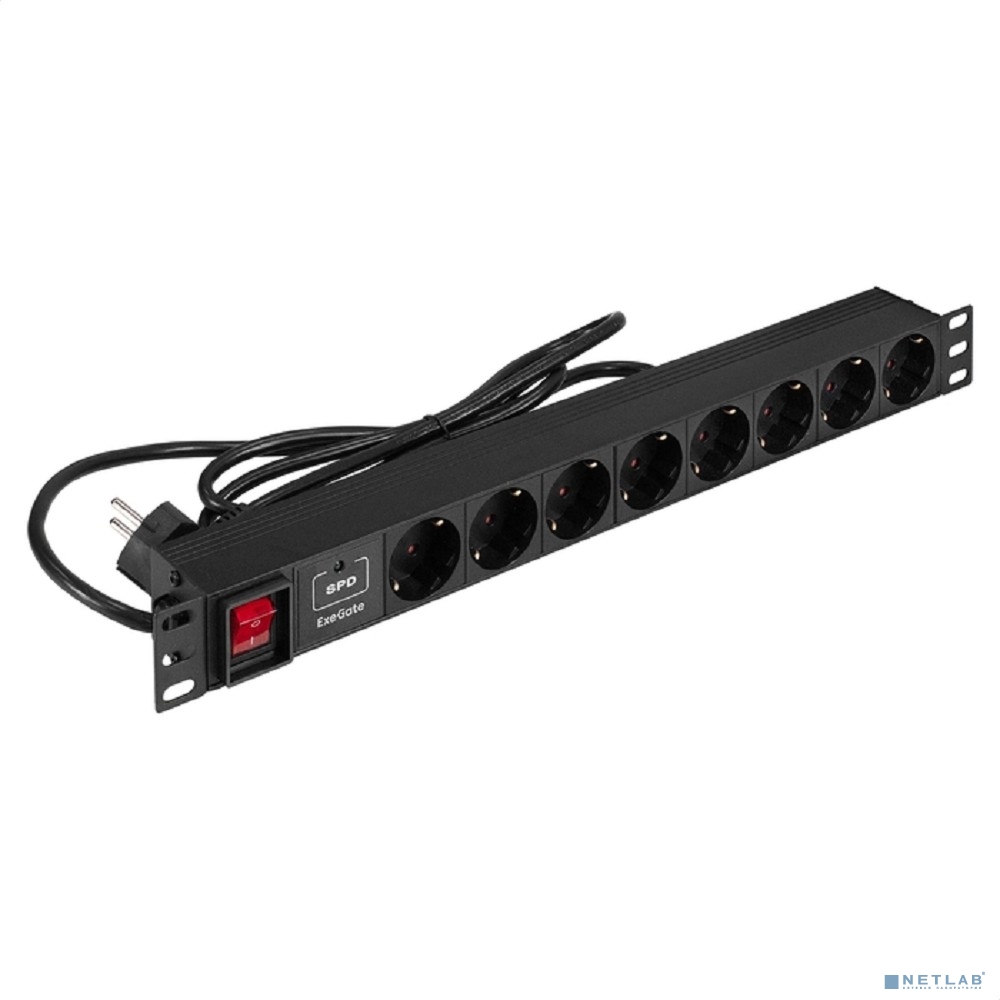 Exegate EX299603RUS Блок розеток с сетевым фильтром (Surge Protect) и выключателем с подсветкой ExeGate ServerPro PDU-19H805 Al-8S-EU3CU-SW-SPD1 (19", 1U, Алюминий, 8 Schuko, кабель с евровилкой VDE-2