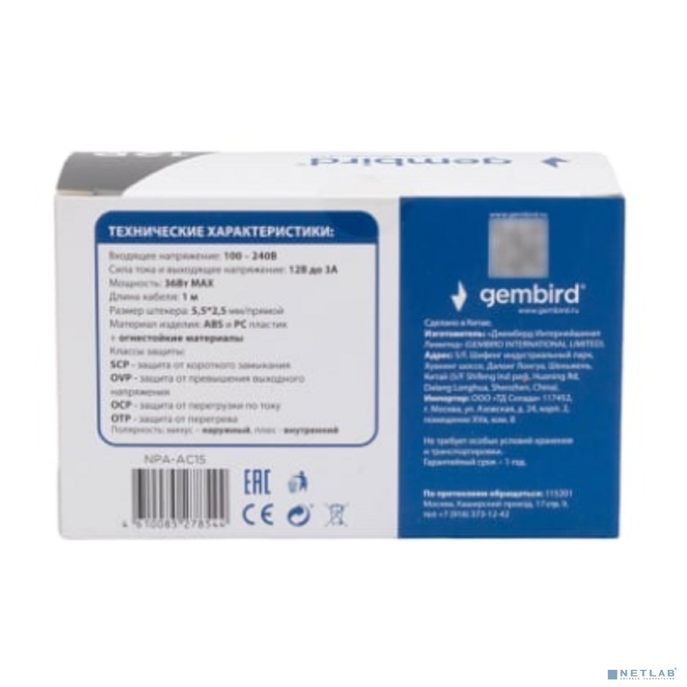 Gembird Блок питания 12В/3А, 36Вт, 1 штекер 5,5х2,5мм (NPA-AC15)
