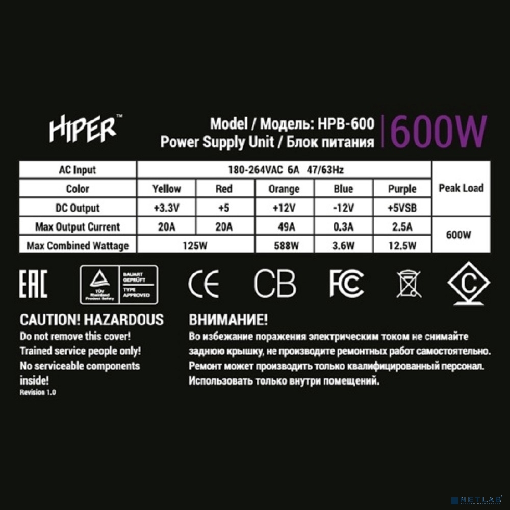 HIPER Блок питания HPB-600 (ATX 2.31, 600W, Active PFC, 80Plus BRONZE, 140mm fan, Black) BOX