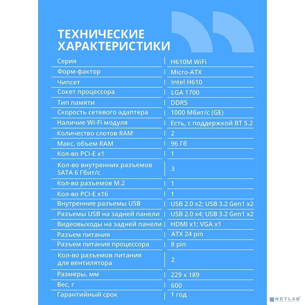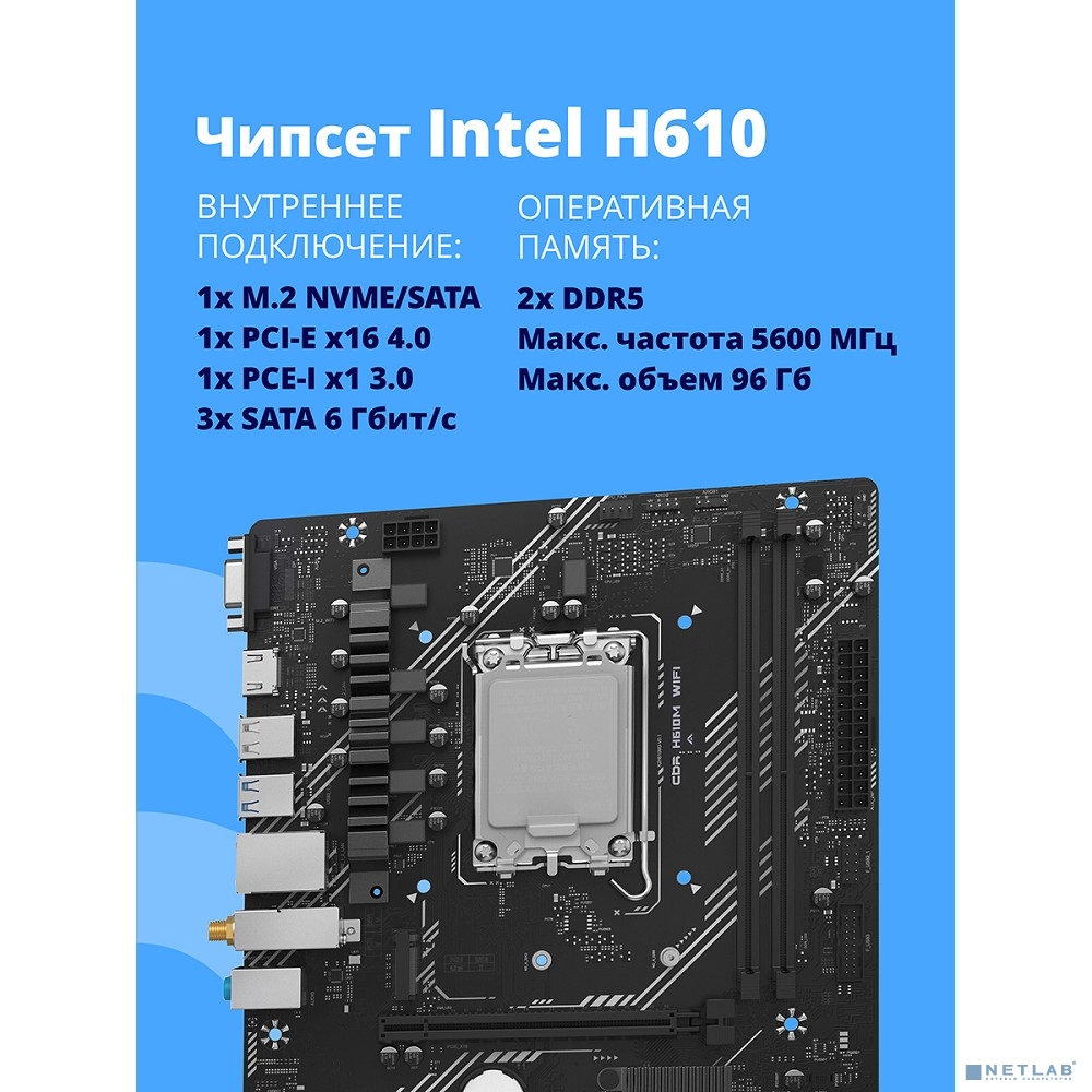 Материнская плата CBR H610M WiFi { Chipset H610, Socket 1700, 2*DDR5, mATX, DP+HDMI, 1*PCIEx16,1*PCIEx1,1*M.2 NVME, 3*SATA3, 4*USB 2.0 + 2*USB3.0,WiFi, LAN 1Gb}