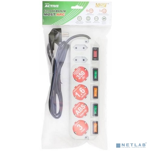 MOST Сетевой фильтр ARG 1.6м 6 розеток (ARG-Б 1.6), белый (пакет ПЭ) {359281}