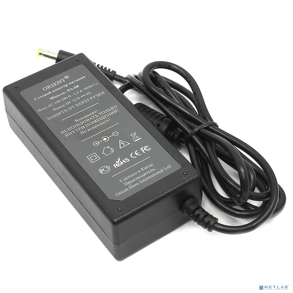 ORIENT PA-08, Блок питания DC 12V, 4.0A, стабилизированный, защита от КЗ и перегрузки ( Imax~4.5А ), вилка с кабелем (29506)