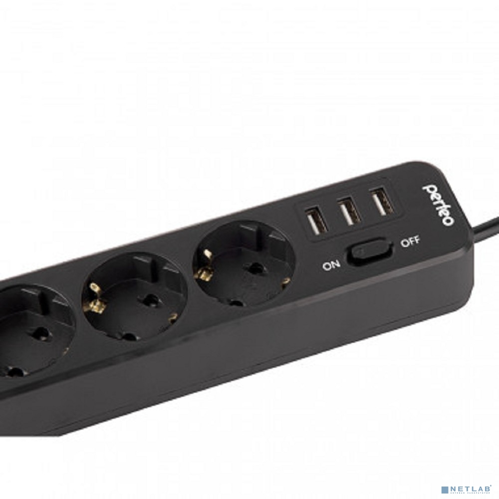 Perfeo сетевой фильтр "POWER STREAM", 2500W, двойная защита, 4м, 3 розетки, 3 USB, черный.