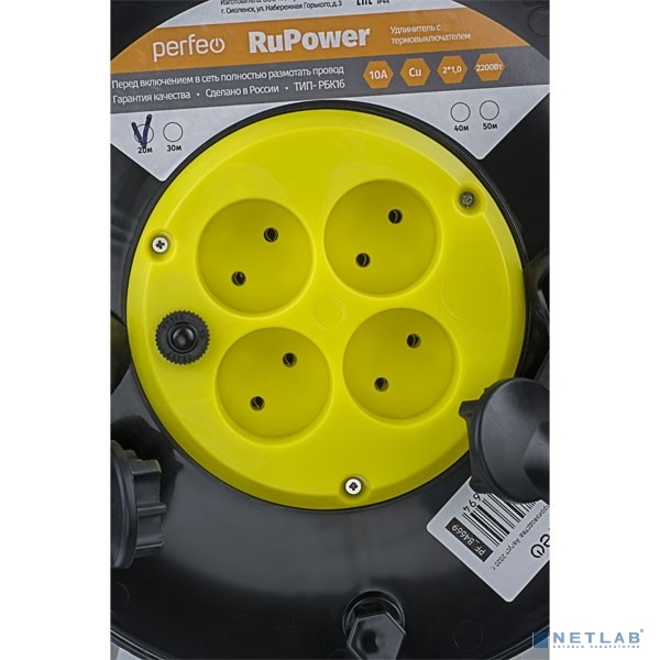 Perfeo удлинитель на катушке без заземления "RU POWER",PF_B4669 (20м 4гн с т/з 10А ПВС 2х1 IP44 (РБК16))