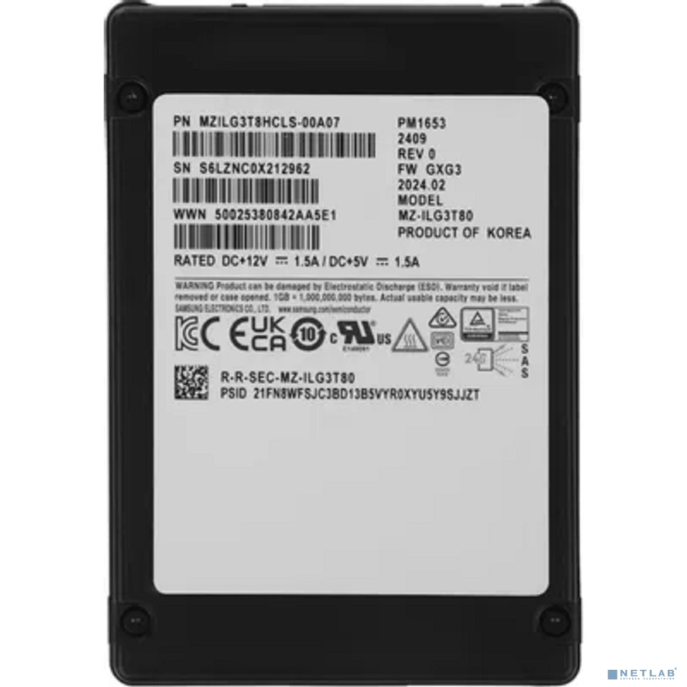 Samsung SSD PM1653, 3840GB, 2.5" 15mm, SAS 24Gb/s, 3D TLC, R/W 4200/up 3800MB/s, IOPs 770 000/135 000, TBW 7008, DWPD 1 (12 мес.) (MZILG3T8HCLS-00A07)